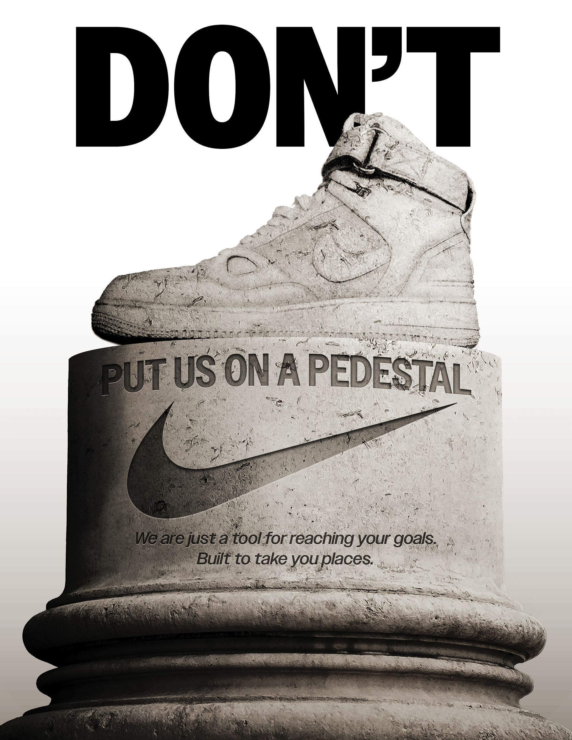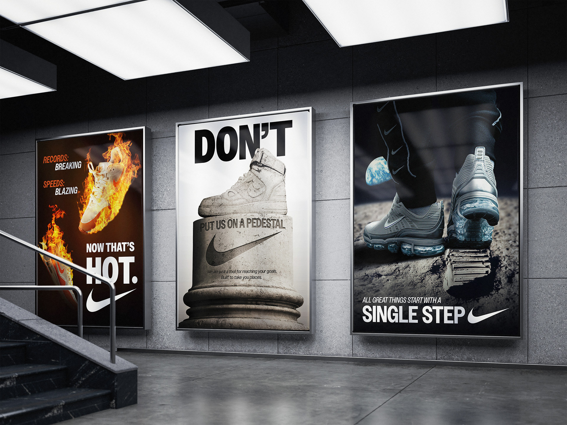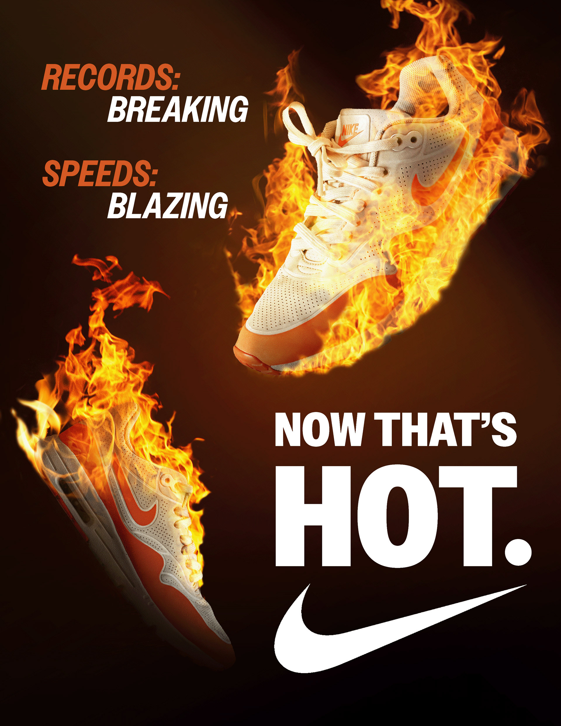 The goal of this spec project was to create 3 separate and unique product advertisements that are inventive but stay true to the brand’s personality and message. Nike’s brand message is overall motivational so I chose concepts that reflect passion, strength, and inspiration in fire, stone, and space exploration respectively.