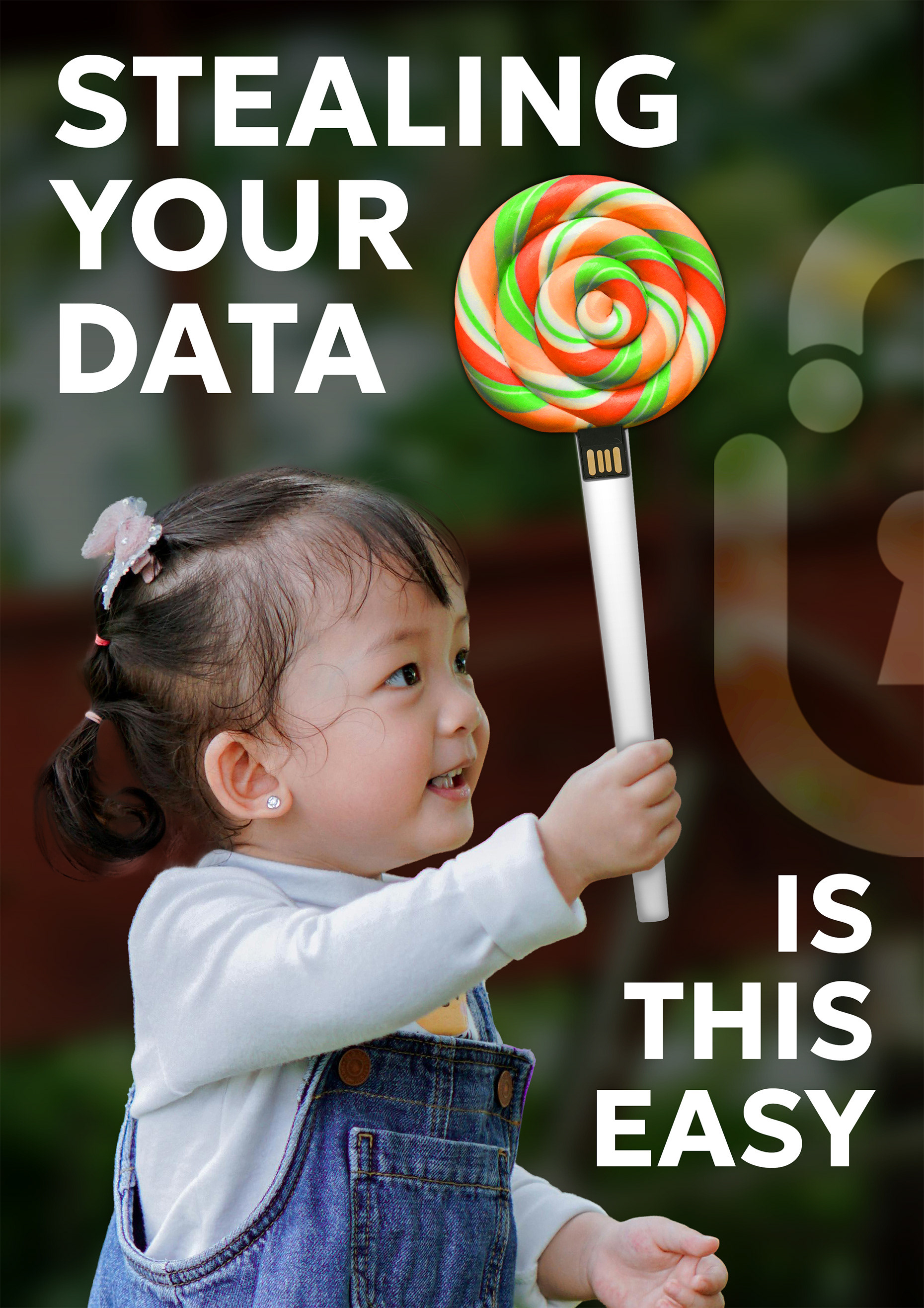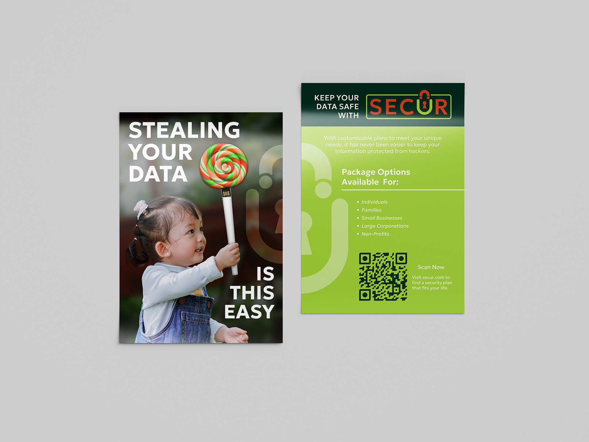 This piece of direct mail is part of a larger branding campaign for Secur, a company that specializes in cybersecurity for individuals and businesses. This direct mail specifically targets one of Secur’s primary audiences: families. By using a young toddler to deliver the brand message, parents and guardians will be immediately invested emotionally. The secondary tactic leverages the lollipop shape and imagery as a free USB storage device that customers can keep. This reusable device promotes customer involvement and creates a lasting touchpoint for repeated interaction.